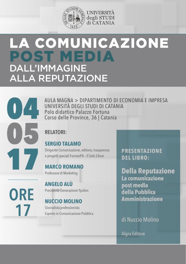 Giovedì 4 maggio alle 17, nell'aula magna di Palazzo Fortuna (dipartimento di Economia e Impresa, corso delle Province 36, Catania), si presenta il volume “Della reputazione - La comunicazione post media della pubblica amministrazione” (Algra Editore) del giornalista ed esperto in comunicazione pubblica Nuccio Molino.
