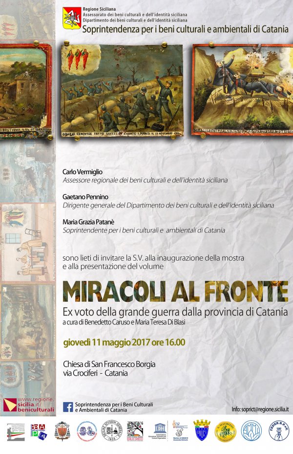 Giovedì 11 maggio alle 16, alla Chiesa di San Francesco Borgia a Catania, sarà presentata la mostra Miracoli al fronte. Ex voto della Grande Guerra della provincia di Catania, curata dalla Soprintendenza ai Beni Culturali di Catania. L'ingresso è libero.