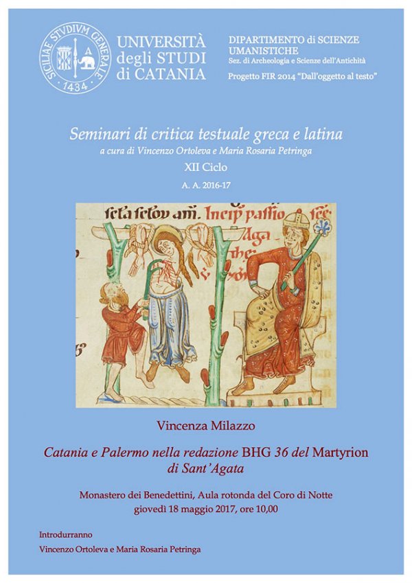 Giovedì 18 maggio alle 10, nell’aula rotonda del Coro di notte, al Monastero dei Benedettini (dipartimento di Scienze umanistiche), la prof.ssa Vincenza Milazzo terrà il seminario dal titolo "Catania e Palermo nella redazione BHG 36 del Martyrion di Sant’Agata", inserito nel ciclo 2016/17 dei "Seminari di critica testuale greca e latina".