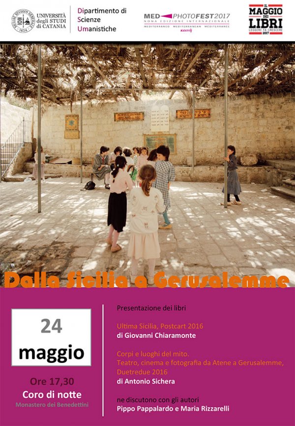 Nel corso dell'iniziativa - inserita nel calendario "Il Maggio dei Libri" - saranno presentati i libri "Ultima Sicilia" di Giovanni Chiaramonte (Postcart, 2016) e "Corpi e luoghi del mito - Teatro, cinema e fotografia da Atene a Gerusalemme" di Antonio Sichera (pubblicato nella collana dei quaderni di Arabeschi di Duetredue, 2016).