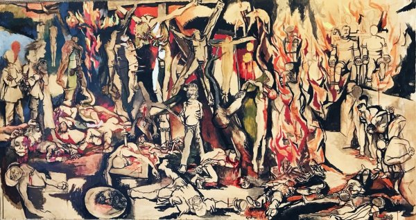 Gli olii su tela che ritraggono figure umane in interni domestici (un suo topos stilistico), nature morte, processioni di martiri e un carrettiere a riposo, dialogano con le chine su carta in cui quelli che appaiono abbozzi e appunti presentano già la consistenza del lavoro finito. Ad esempio, gli “studi per la crocefissione” presenti in mostra, sebbene siano solo una parte del lavoro completo, hanno in se stessi una forza e una personalità che pochi artisti, come Guttuso, sono in grado di creare con il solo gesto della propria mano.