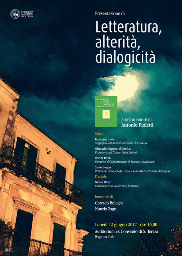 Lunedì 12 giugno alle 16, nell'auditorium dell'ex convento di Santa Teresa a Ragusa Ibla (struttura didattica di Lingue e Letterature straniere), si tiene la presentazione del volume di studi in onore di Antonio Pioletti "Letteratura, alterità, dialogicità" (Rivista di Filologia Moderna "Le forme e la storia", Rubettino, 2016), a cura di Eliana Creazzo, Gaetano Lalomia e Andrea Manganaro.