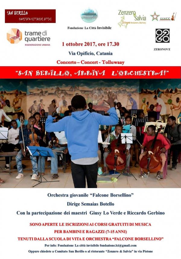 L' Orchestra giovanile Falcone Borsellino della Fondazione "La città invisibile" diretta dal Maestro Semaias Botello darà un concerto all'interno del quartiere San Berillo per promuovere le iscrizioni ai corsi di musica destinati ai bambini, con i maestri Giusy Lo Verde, Riccardo Gerbino, Serena Sicari.