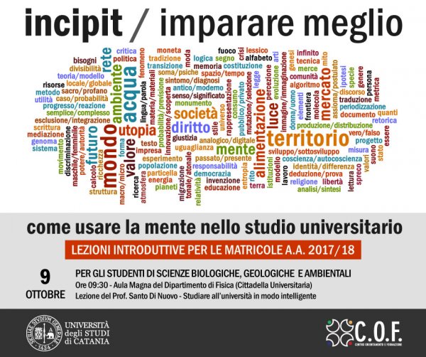 Lunedì 9 ottobre alle 9:30, nell'aula magna del dipartimento di Fisica e Astronomia (Cittadella Universitaria, via Santa Sofia 64, Catania), prosegue “Incipit / Imparare meglio: come usare la mente nello studio universitario”, il ciclo di lezioni dedicate alle matricole dell'a.a. 2017/18.