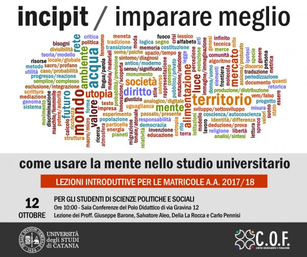 - Incipit / Scienze politiche e sociali: Giovedì 12 ottobre alle 10, nella sala conferenze del Polo didattico "Gravina", giornata di benvenuto per le matricole dell'a.a. 2017/18 (12 ottobre 2017)