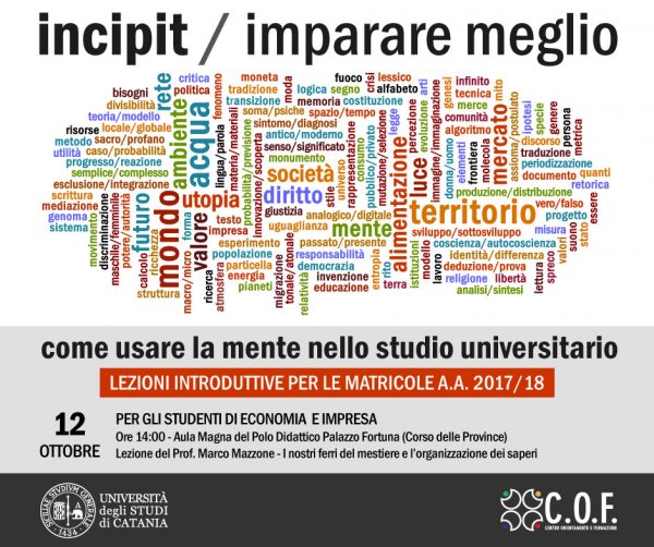 Giovedì 12 ottobre alle 14, nell'aula magna di Palazzo Fortuna (corso delle Province 36, Catania), prosegue “Incipit / Imparare meglio: come usare la mente nello studio universitario”, il ciclo di lezioni dedicate alle matricole dell'a.a. 2017/18.