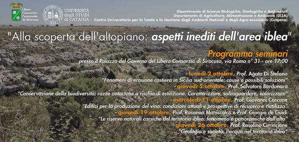 Giovedì 5 ottobre alle 17 al Palazzo del Governo del Libero Consorzio di Siracusa prosegue il ciclo di seminari dal titolo "Alla scoperta dell'altopiano: aspetti inediti dell'area Iblea".