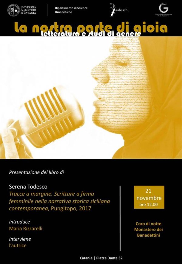 Martedì 21 novembre alle 12, nel Coro di notte del Monastero dei Benedettini, si presenta il libro di Serena Todesco "Tracce a margine - scritture a firma femminile nella narrativa storica siciliana contemporanea" (Pungitopo, 2017).