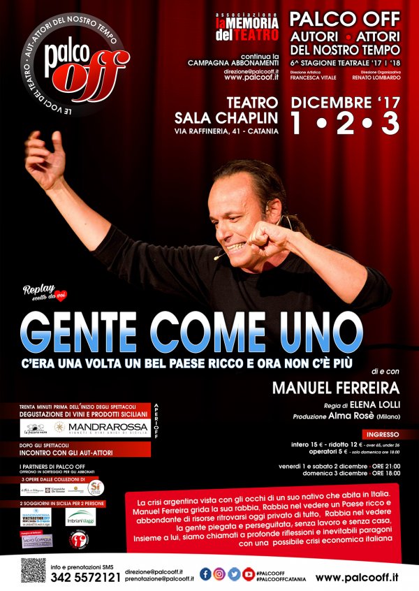 Venerdì 1, sabato 2 (ore 21) e domenica 3 dicembre (ore 18), al teatro Sala Chaplin a Catania, andrà in scena lo spettacolo Gente come uno - C'era una volta un paese ricco e ora non c'è più, di Manuel Ferreira e Elena Lolli, produzione Alma Rosé, per la rassegna teatrale di Palco Off.