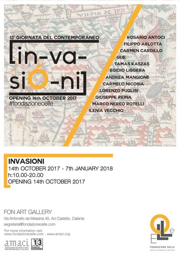Fino al 7 gennaio, negli spazi Fon Art Gallery a Catania (via Antonello da Messina 45, Acicastello), la Fondazione Oelle Mediterraneo Antico ospiterà la mostra Invasioni, con le opere di artisti siciliani e internazionali.