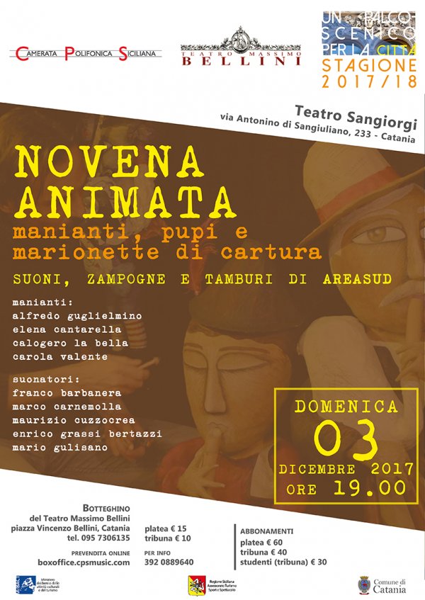 Domenica 3 dicembre alle 19, al Teatro Sangiorgi di Catania, andrà in scena la Novena Animata, con pupi e marionette di cartura, su suoni e i ritmi dei musicisti di Areasud, per la rassegna "Un Palcoscenico per la città".