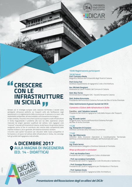 Lunedì 4 dicembre alle 10, nell'aula magna dell'Edificio per la Didattica di Ingegneria (Edificio 14, Cittadella Universitaria) si apre il convegno "Crescere con le infrastrutture in Sicilia", organizzato dal dipartimento di Ingegneria Civile e Architettura dell'Università di Catania.