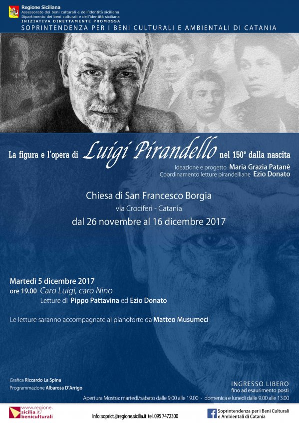 Martedì 5 dicembre alle 19, nella Chiesa di San Francesco Borgia a Catania, prosegue la rassegna La figura e l'opera di Luigi Pirandello nel 150° anniversario dalla nascita.