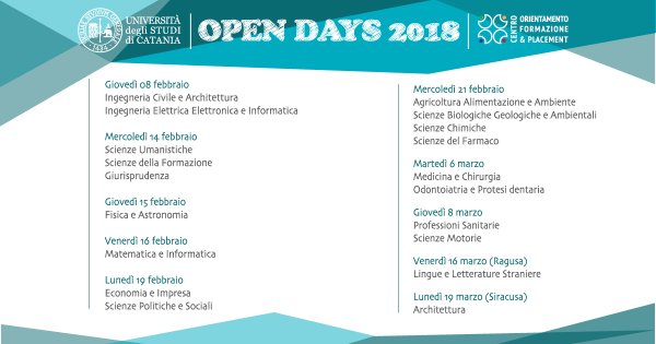 Giovedì 8 febbraio, a partire dalle 9, alla Cittadella Universitaria (edifici 4 e 14, via Santa Sofia 64, Catania), si svolge "OpenING minds", primo appuntamento degli Open Days 2018 di orientamento alla scelta universitaria, promossi dall’Università di Catania tramite il Centro Orientamento, Formazione e Placement.