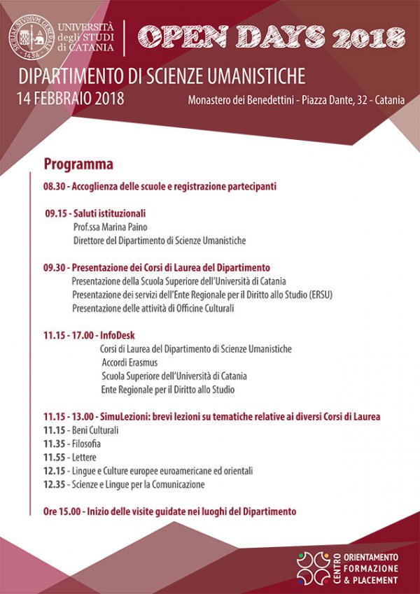 Mercoledì 14 febbraio, a partire dalle 8:30, al Monastero dei Benedettini (piazza Dante 32, Catania), si svolge un nuovo appuntamento degli Open Days 2018 di orientamento alla scelta universitaria, promossi dall’Università di Catania tramite il Centro Orientamento, Formazione e Placement.