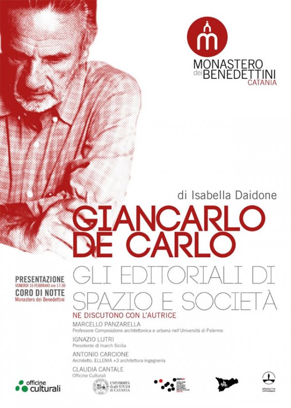 Venerdì 16 febbraio alle 17:30, nel Coro di notte del Monastero dei Benedettini, Officine Culturali, in collaborazione con il dipartimento di Scienze umanistiche e con l’Ordine degli Architetti di Palermo, Inarch Sicilia ed Ellenia+ 3, discuteranno dell’architetto Giancarlo De Carlo a partire dal libro di Isabella Daidone “Giancarlo De Carlo. Gli editoriali di Spazio e Società” (Gangemi editore).