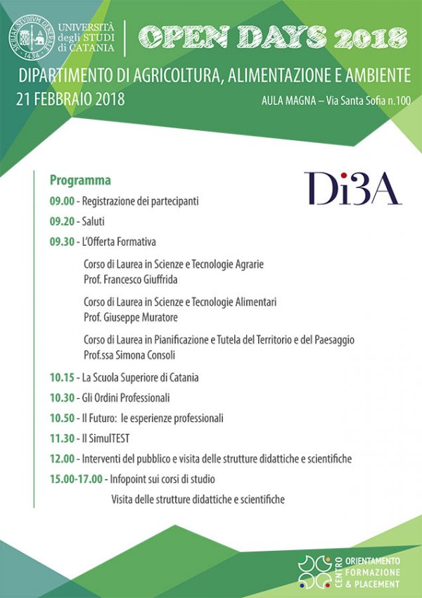 Mercoledì 21 febbraio, a partire dalle 9, nell'aula magna del Polo bioscientifico di Agraria (dipartimento di Agricoltura, Alimentazione e Ambiente, via Santa Sofia 100, Catania), si svolge un nuovo appuntamento degli Open Days 2018 di orientamento alla scelta universitaria, promossi dall’Università di Catania tramite il Centro Orientamento, Formazione e Placement.