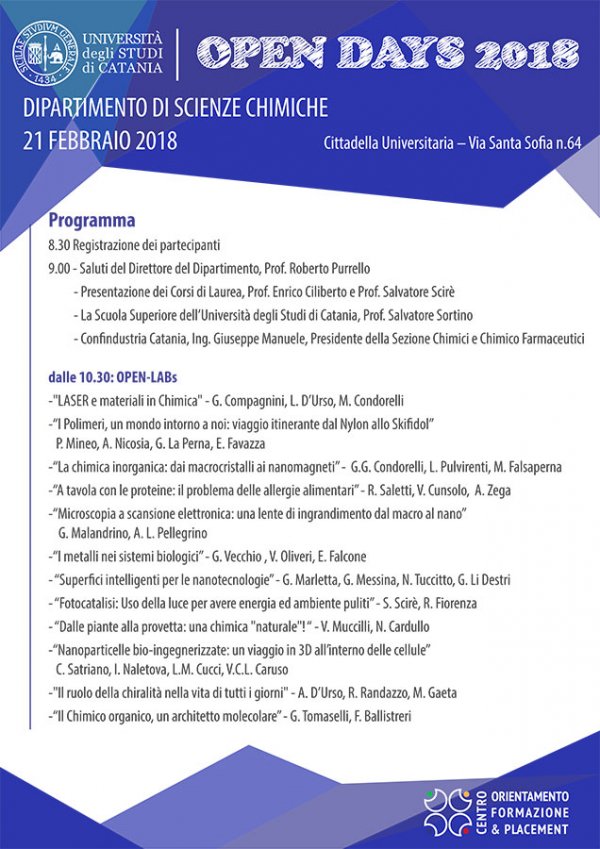 Si tratta dell'Open Day dedicato alla presentazione dell’offerta didattica e degli sbocchi occupazionali e professionali dei corsi di studio del dipartimento di Scienze chimiche (Dsc).