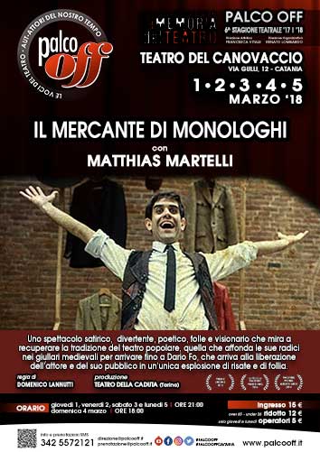 Da giovedì 1 a lunedì 5 marzo, al Teatro del Canovaccio a Catania, andrà in scena Il Mercante di Monologhi, una produzione Teatro della Caduta (Torino), per la rassegna "Palco Off".