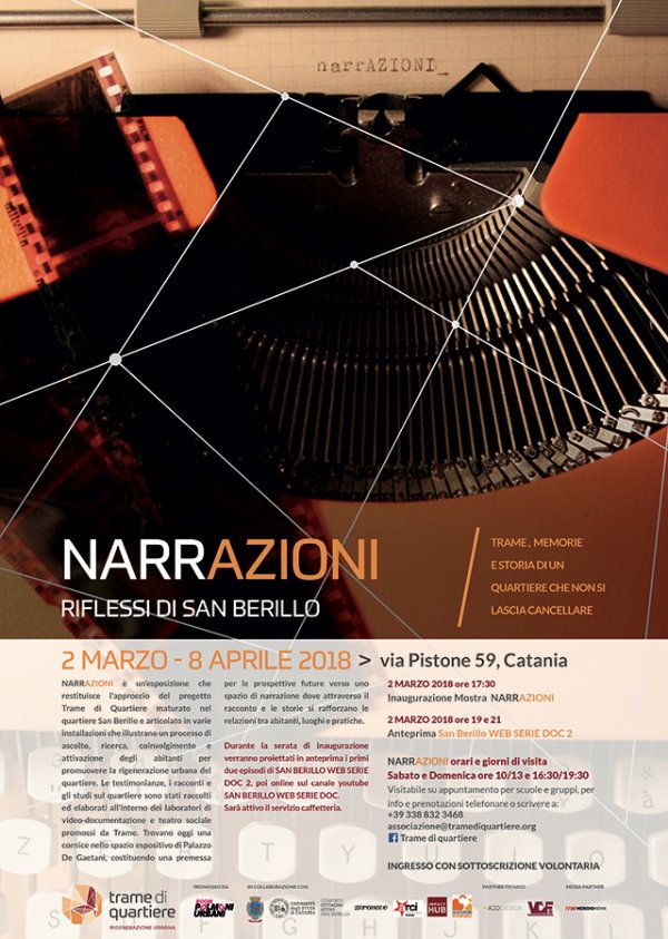 Narrazioni è una mostra che restituisce l'approccio del progetto Trame di Quartiere maturato nel quartiere San Berillo e si articola in fotografie, installazioni audio e video, linee del tempo e collage che illustrano un processo di ascolto, ricerca, coinvolgimento e attivazione degli abitanti per promuovere la rigenerazione urbana del quartiere.