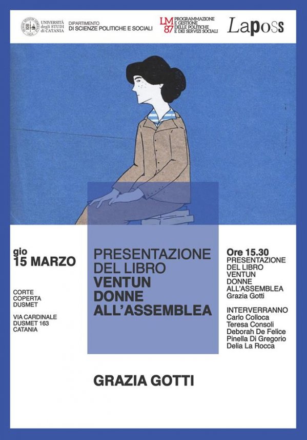 Giovedì 15 marzo alle 15:30, nella corte coperta "Dusmet" (dipartimento di Scienze politiche e sociali, ex Falegnameria Scannapieco, Via Cardinale Dusmet 163 - Catania), si presenta il libro di Grazia Gotti dal titolo "21 donne all'Assemblea" (Bompiani, 2016).