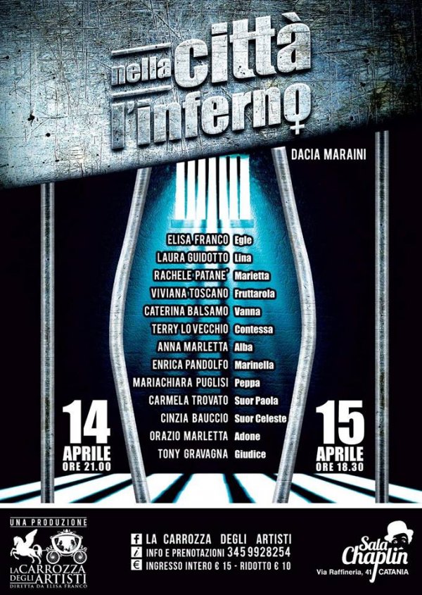 Sabato 14 e domenica 15 aprile (ore 21), alla Sala Chaplin di Catania, andrà in scena la compagnia teatrale "La Carrozza degli Artisti" con lo spettacolo Nella città l'inferno, di Dacia Maraini.