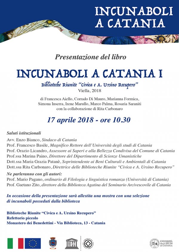 Martedì 17 aprile alle 10:30, alle Biblioteche Riunite "Civica e Ursino Recupero" (Monastero dei Benedettini, ingresso via Biblioteca 13), si presenta il catalogo "Incunaboli a Catania I" (Viella, 2018).