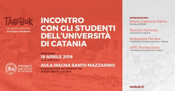 Mercoledì 18 aprile alle 16, nell’aula magna “Santo Mazzarino” del Monastero dei Benedettini, sarà presentata agli studenti dell’Università di Catania l’ottava edizione del festival “Taobuk”.