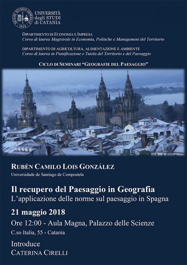 Lunedì 21 maggio alle 12, nell’aula magna del Palazzo delle Scienze (Dipartimento di Economia e Impresa, corso Italia 55, Catania), Rubén Camilo Lois González, ordinario di Geografia all’Università di Santiago de Compostela, terrà un seminario dal titolo “Il recupero del Paesaggio in Geografia - L’applicazione delle norme sul Paesaggio in Spagna”.
