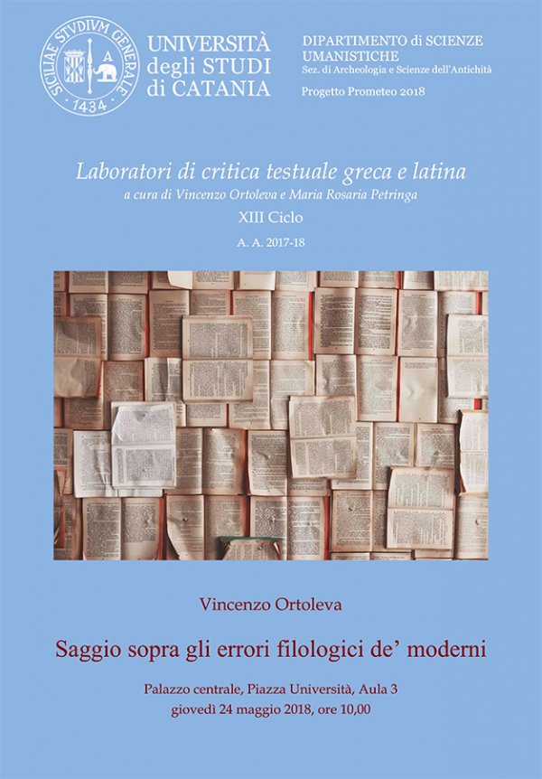 Giovedì 24 maggio alle 10, nell'aula "21 marzo" di Palazzo Pedagaggi (Dipartimento di Scienze politiche e sociali, Via Vittorio Emanuele II, 49 Catania), il prof. Vincenzo Ortoleva, docente di Filologia e Grammatica greca e latina (Dipartimento di Scienze umanistiche, Unict) tiene il seminario dal titolo "Saggio sopra gli errori filologici de' moderni", inserito nel ciclo 2017/18 dei Laboratori di critica testuale greca e latina.