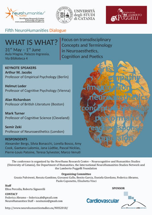 Il Quinto “NeuroHumanities Dialogue” si pone quindi come obiettivo un incontro in forma dialogica, che porti alla creazione di un bagaglio terminologico e concettuale interdisciplinare. Fra gli studiosi che interverranno quest’anno saranno presenti: Mark Turner, esperto di fama mondiale di Scienze cognitive alla Case Western Reserve University, fondatore e direttore del Cognitive Science Network; Semir Zeki, celebre neurologo dell’UCL di Londra, fondatore della Neuroestetica; Helmut Leder, professore di Psicologia cognitiva e coordinatore della Cognitive Sciences Research Platform all’Università di Vienna; Alan Richardson, celebre studioso di Poetica cognitiva, letteratura, culture e linguaggi del periodo romantico; il rinomato studioso di psicologia sperimentale e neurocognitiva Arthur Jacobs della Freie Universität di Berlino, specialista in indagini sui processi della lettura.