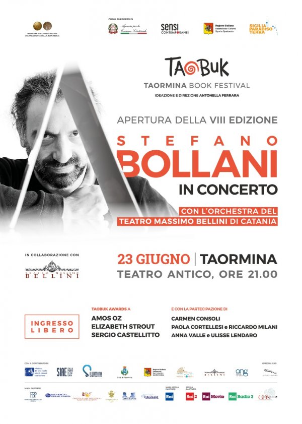 Sabato 23 giugno alle 21, al Teatro Antico di Taormina, Stefano Bollani si esibirà in concerto con l'Orchestra del Teatro Massimo Bellini di Catania, in apertura della VIII edizione di Taormina Book Festival.