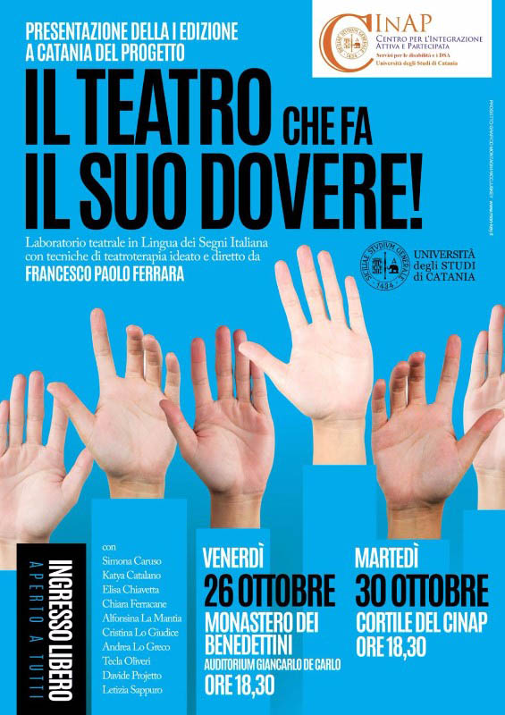 Venerdì 26 ottobre alle 18:30, nell’Auditorium "Giancarlo De Carlo" del Monastero dei Benedettini", il Centro per l’Integrazione Attiva e Partecipata (CInAP) presenta la prima edizione del progetto “Il teatro che fa il suo dovere”.