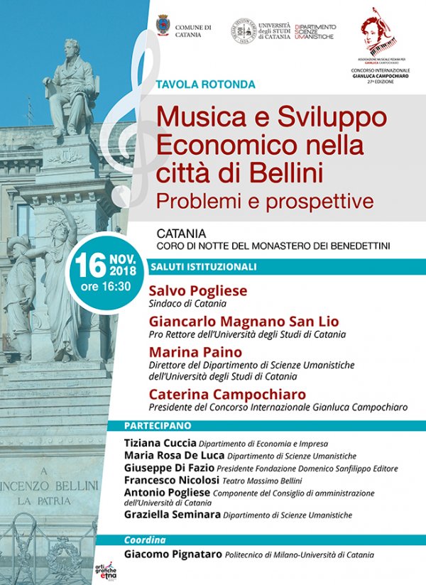 Venerdì 16 novembre alle 16:30, al Coro di notte del Monastero dei Benedettini, si terrà la tavola rotonda dal titolo “Musica e sviluppo economico nella città di Bellini – Problemi e prospettive”.