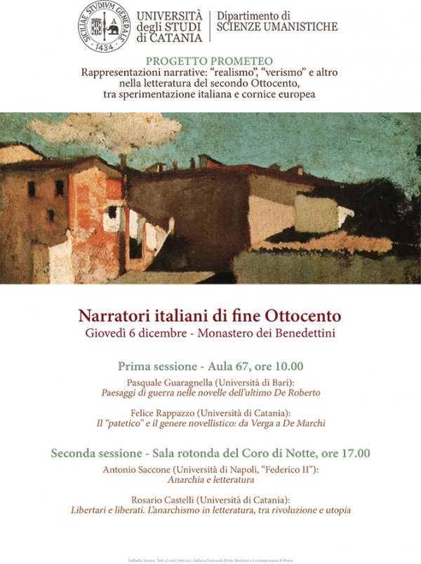 Giovedì 6 dicembre alle 10, nell'Aula 67 del Monastero dei Benedettini (Dipartimento di Scienze umanistiche), prendono il via i lavori della giornata di studio “Narratori italiani di fine Ottocento”, organizzata nell'ambito del Progetto Prometeo “Rappresentazioni narrative: realismo, verismo e altro nella letteratura del secondo Ottocento, tra sperimentazione italiana e cornice europea”.