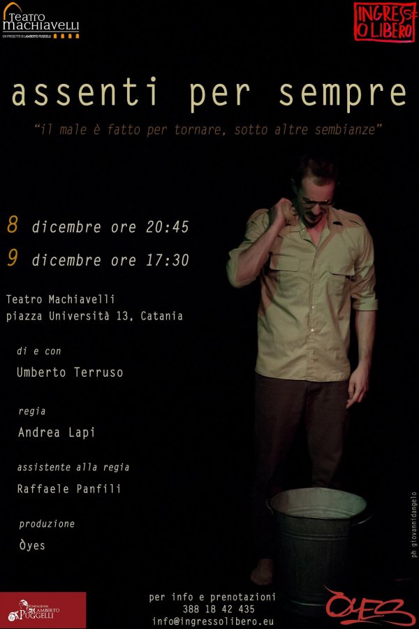 Sabato 8 (ore 20:45) e domenica 9 dicembre (ore 17:30), al Teatro Machiavelli di Catania, la Compagnia Òyes di Milano presenta Assenti per sempre di e con Umberto Terruso, per la regia di Andrea Lapi.