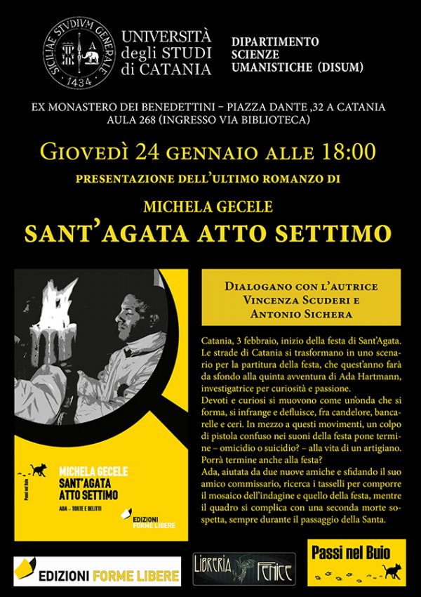 Giovedì 24 gennaio alle 18, nell’aula 268 del Monastero dei Benedettini (ingresso di via Biblioteca), il Dipartimento di Scienze umanistiche dell’Università di Catania, insieme a Edizioni Forme Libere (Trento) e alla libreria Fenice (Catania) presentano l’ultimo romanzo di Michela Gecele "Sant’Agata atto settimo" (Edizioni Forme libere – Collana Due passi nel buio, 2019).