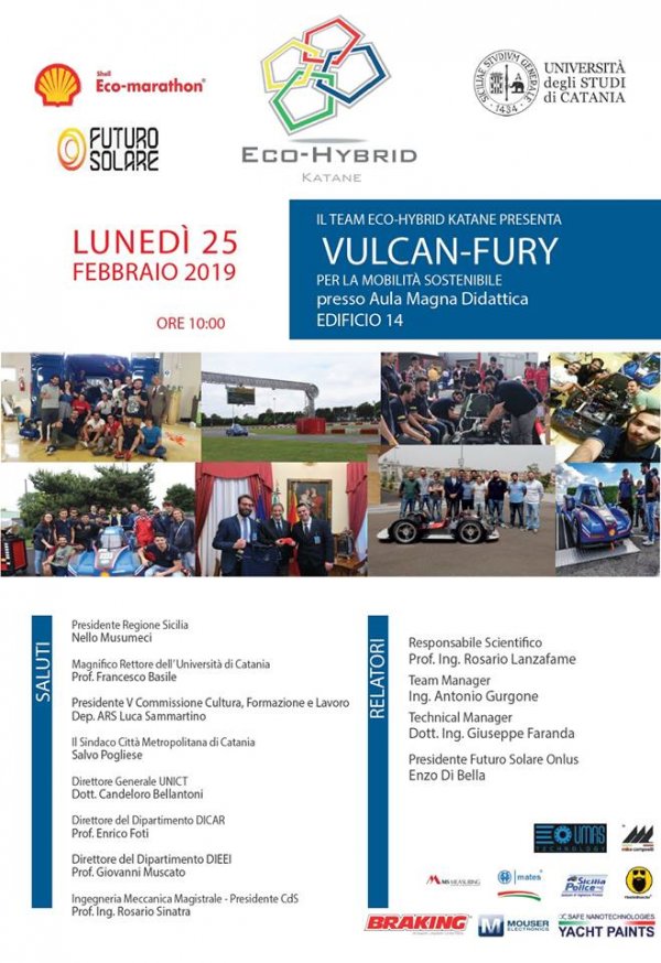 Battesimo ufficiale, lunedì 25 febbraio alla Cittadella universitaria, per “Vulcan-Fury”, il prototipo di auto ibrida realizzato dal team etneo “Eco Hybrid Katane”, composto da trenta studenti dei dipartimenti di Ingegneria dell’Università di Catania.