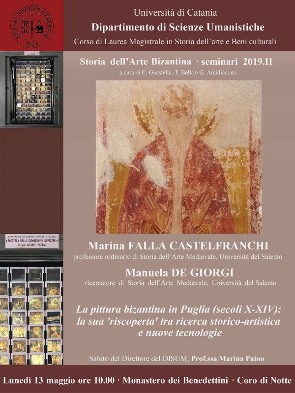 Lunedì 13 maggio alle 10, al Coro di notte del Monastero dei Benedettini (Piazza Dante 32, Catania), si svolge il seminario "La pittura bizantina in Puglia (secoli X-XIV): la sua riscoperta tra ricerca storico-artistica e nuove tecnologie", tenuto da Marina Falla Castelfranchi e Manuela De Giorgi, docenti di Storia dell'arte medievale all'Università del Salento.