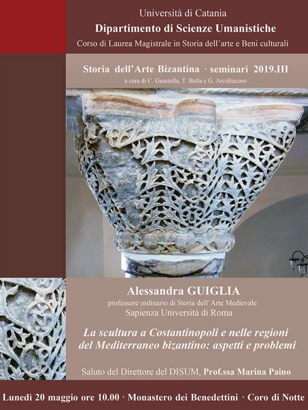 Lunedì 20 maggio alle 10, al Coro di notte del Monastero dei Benedettini (Piazza Dante 32, Catania), si svolge il seminario "La scultura a Costantinopoli e nelle regioni del Mediterraneo bizantino: aspetti e problemi", tenuto da Alessandra Guiglia, docente di Storia dell'arte medievale all'Università "Sapienza" di Roma.