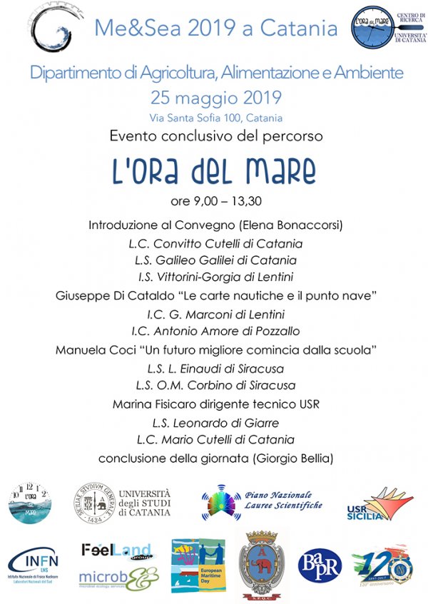 Si tratta dell'evento conclusivo del percorso “L’ora del mare” avviato dall'omonimo centro di ricerca d'Ateneo con il supporto dei delegati catanesi del Piano Nazionale Lauree Scientifiche, nell'ambito della più ampia iniziativa "Me&Sea" promossa sin dal 2015 dall'associazione FeelLand per celebrare la Giornata europea del mare.