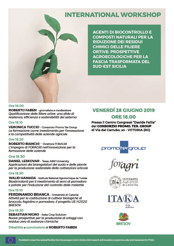 Venerdì 28 giugno alle 18, al Centro Congressi "Davide Failla" (via del Carrubbo sn, Vittoria - Ragusa), si svolge il workshop internazionale "Agenti di biocontrollo e composti naturali per la riduzione dei residui chimici delle filiere ortive: prospettive agroecologiche per la fascia trasformata del Sud-Est Sicilia", organizzato nell'ambito delle attività del progetto Bresov, finanziato dal programma europeo per la ricerca e l'innovazione Horizon 2020.