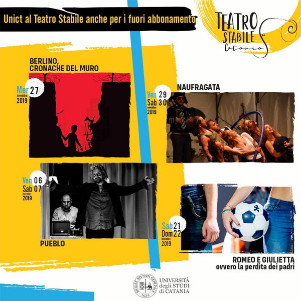 Per gli spettacoli fuori abbonamento, gli studenti e il personale docente e tecnico amministrativo di Unict usufruiscono del biglietto ridotto: 12 euro. Per acquistare il biglietto ridotto, basta presentare al botteghino del Teatro Stabile, il badge personale, la Carta dello Studente o altra attestazione equivalente.