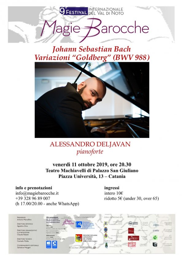 Venerdì 11 ottobre (ore 20:30), al Teatro Machiavelli di Catania, l'Associazione Festival Internazionale del Val di Noto Magie Barocche in collaborazione con Teatro Machiavelli, Fondazione Lamberto Puggelli, A.P.S. Ingresso Libero, Università degli Studi di Catania, presenta le Variazioni Goldberg BWV 988 di Johann Sebastian Bach eseguite al pianoforte da Alessandro Deljavan.