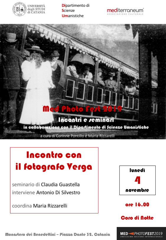 Il secondo appuntamento in programma è il seminario dal titolo "Incontro con il fotografo Verga" tenuto dalla prof.ssa Claudia Guastella (Storia dell'arte medievale, Università di Catania) con un intervento del prof. Antonio Di Silvestro (Filologia della Letteratura italiana).