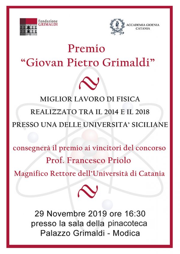 Il premio, previsto dal testamento del professor Grimaldi (1860-1918), ha lo scopo di valorizzare il miglior lavoro di fisica elaborato nel quinquennio 2014/2018 in una delle università siciliane o in centri di ricerca pubblici operanti in Sicilia. Inoltre, intende onorare l’impegno scientifico e civile del suo fondatore. Viene conferito dalla Fondazione Grimaldi in collaborazione con l’Accademia Gioenia di Catania, di cui il professor Grimaldi fu segretario e che lasciò coerede di parte del suo patrimonio.