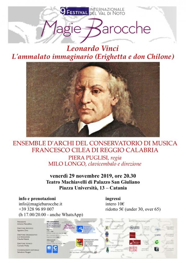 Venerdì 29 novembre (ore 20:30), al Teatro Machiavelli di Catania, l'Associazione Festival Internazionale del Val di Noto Magie Barocche in collaborazione con Teatro Machiavelli, Fondazione Lamberto Puggelli, A.P.S. Ingresso Libero, Università degli Studi di Catania, presentaIl Festival Internazionale del Val di Noto “Magie Barocche” presenta: Leonardo Vinci. L'ammalato immaginario - Erighetta e Don Chilone, con l'Ensemble d'archi del Conservatorio Francesco Cilea di Reggio Calabria.