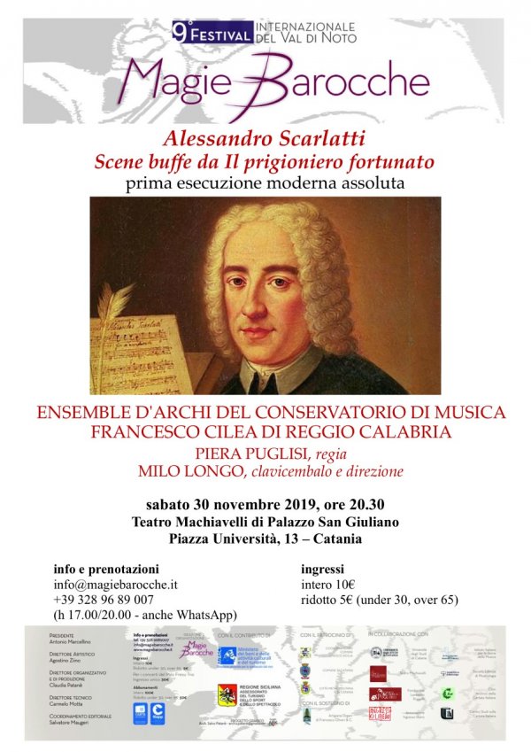 Sabato 30 novembre (ore 20:30), al Teatro Machiavelli di Catania, l'Associazione Festival Internazionale del Val di Noto Magie Barocche in collaborazione con Teatro Machiavelli, Fondazione Lamberto Puggelli, A.P.S. Ingresso Libero, Università degli Studi di Catania, presentaIl Festival Internazionale del Val di Noto “Magie Barocche” presenta: Scene buffe da "Il prigioniero fortunato", con l'Ensemble d'archi del Conservatorio Francesco Cilea di Reggio Calabria.