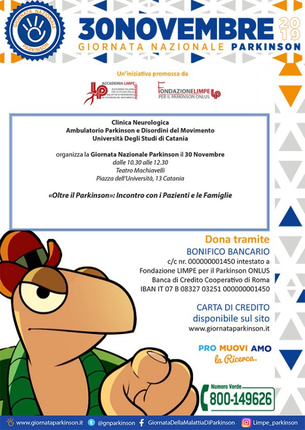 Sabato 30 novembre alle 10:30, al Teatro Machiavelli di Palazzo Sangiuliano (Piazza dell’Università, 13 - Catania), si svolge l'iniziativa "Oltre il Parkinson: incontro con i pazienti e le famiglie", organizzata dalla Clinica neurologica diretta dal prof. Mario Zappia e dall'Ambulatorio Parkinson e Disordini del Movimento dell'AOU “Policlinico-Vittorio Emanuele” in occasione della Giornata nazionale della Malattia di Parkinson indetta dalla Fondazione Limpe per il Parkinson Onlus.