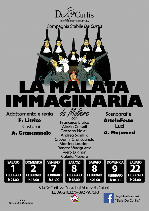 La compagnia propone un grande classico: l’ultima irridente opera di Jean Baptiste Poqueline, in arte Molière. Una tragicomica nevrosi ipocondriaca, abilmente descritta tre secoli or sono dal celebre maestro francese. "La malata immaginaria" è una particolare rivisitazione in chiave femminile del celebre testo seicentesco, del quale conserva invariati gli ingredienti originali: comicità, satira, realismo. Una "Malata" in salsa siciliana, nel contesto di una surreale atmosfera seicentesca, tra broccati, medicamenti, parrucconi e miracolosi clisteri. Con Francesca Litrico, Giovanni Grancagnolo, Martina Laudani, Giovanni Grancagnolo, Alessia Consoli, Gaetano Naselli, Andrea Schillirò, Renato Vinciguerra, Piero Lugan, Valeria Novara.